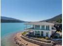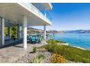 Welcome to 18541 Crystal Waters Rd—an exceptional opportunity in this gated, bare land strata community on Kalamalka Lake. This flat corner lot is the largest in the development, with 130' of lakefront, direct beach access, and a boat lift—offering the ultimate lakeside lifestyle. The Okanagan Rail Trail is in your backyard, providing over 50 km of scenic trails for cycling, walking, and exploring the valley. Inside, massive 10' tall Lift and Slide doors span the front wall and fold away, blending indoor and outdoor living. The spacious kitchen features a large island, mirrored backsplash reflecting lake hues, a walk-in pantry, and premium finishes. Soaring 19' ceilings define the open living area with a gas fireplace, and ceramic tile floors make maintenance easy. A beach bathroom with outside access simplifies water rinsing after lake days. Floating stairs with a glass railing lead upstairs to the primary suite with Nano doors opening to a private deck overlooking the lake. The ensuite includes a standalone tub, frameless shower, dual sinks, and walk-in closet. Two more bedrooms connect to a wraparound deck with lake views. Additional features include solar panels, hot water on demand, built-in vacuum, oversized double garage (or 3 car tandem) with mezzanine storage, 240V EV charger, crawl space, fruit trees (2 apple/plum/nectarine/cherry), and a raised garden bed. The strata fee is $600/month, and two pets of any size are permitted. (id:56537)
